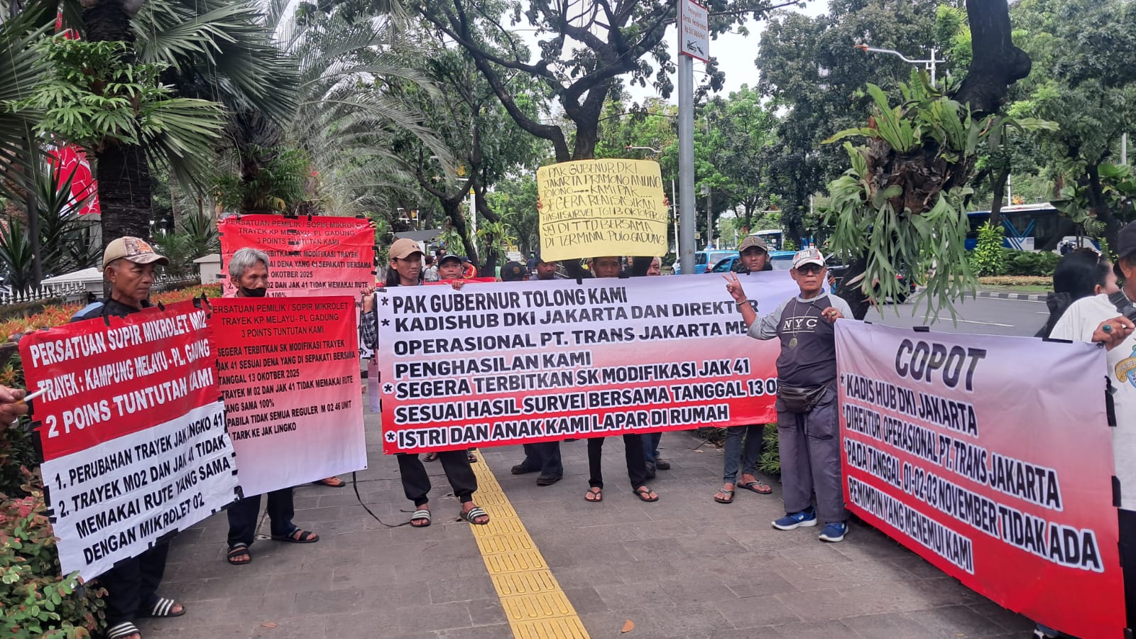Jakarta, 11 November 2025 — Puluhan anggota Persatuan Pemilik dan Sopir Mikrolet M02 rute Kampung Melayu – Terminal Pulogadung menggelar aksi protes di halaman Balai Kota DKI Jakarta pada hari Selasa (11/11). Aksi ini merupakan puncak kekecewaan para sopir yang merasa penghasilan mereka dimatikan akibat rute Mikrolet M02 yang persis sama dengan rute Jaklingko Koridor 41 selama lima tahun terakhir.