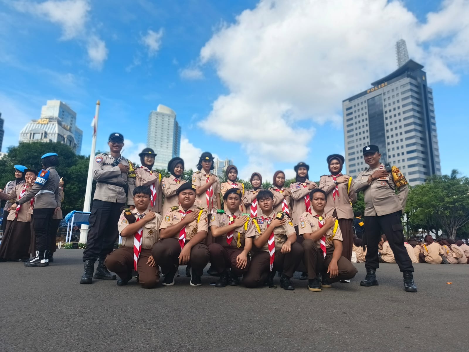 Kegiatan apel berlangsung tertib dan penuh semangat. Para siswa tampak bangga mengenakan seragam Saka Bhayangkara, sementara pendamping dari Polsek Metro Gambir terus memberikan motivasi dan memastikan seluruh peserta mengikuti rangkaian kegiatan dengan baik.