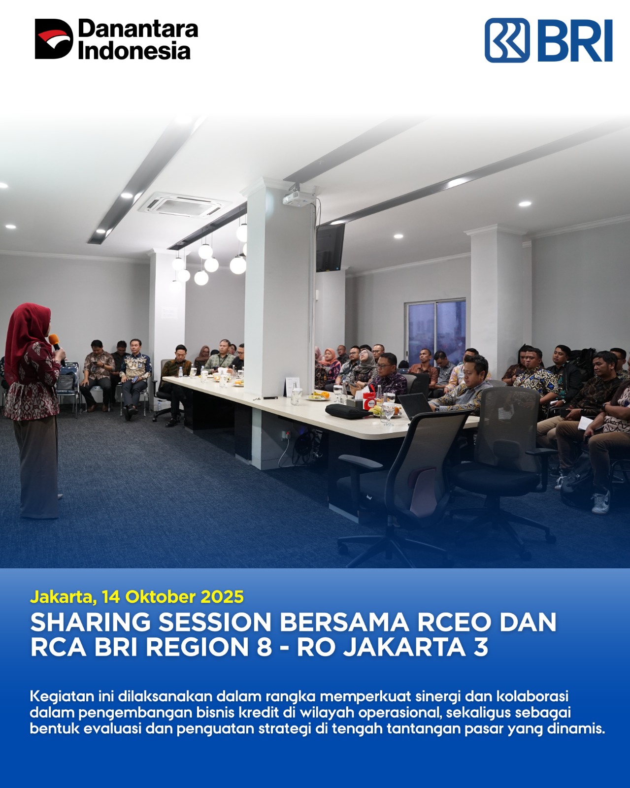 Indonesiakoma.com Jakarta, 14 Oktober 2025 – Bank Rakyat Indonesia (BRI) Regional Office (RO) Jakarta 3 menggelar kegiatan Sharing Session bersama Regional Chief Executive Officer (RCEO) dan Regional Credit Analyst (RCA) BRI Region 8. Acara ini dihadiri oleh para pemimpin cabang, termasuk Adi Sujarwanto, Pemimpin Cabang BRI, serta jajaran pimpinan unit kerja di wilayah operasional Jakarta.