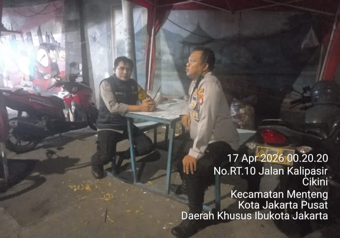 INDONESIAKOMA – Jakarta Pusat – Dalam upaya menjaga stabilitas keamanan di wilayah perbatasan, jajaran Polsek Metro Menteng terus meningkatkan kegiatan preventif melalui patroli dialogis. Bhabinkamtibmas Kelurahan Cikini, Aiptu Tafsipul Subhani, bersama personel Patroli Motor (Patmor) Aiptu Dion Sinaga dan warga melaksanakan pemantauan di kawasan perbatasan Kalipasir, Menteng, Jakarta Pusat, guna mengantisipasi potensi gangguan kamtibmas, aksi curanmor, serta tawuran warga. Jumat (17/4/2026)