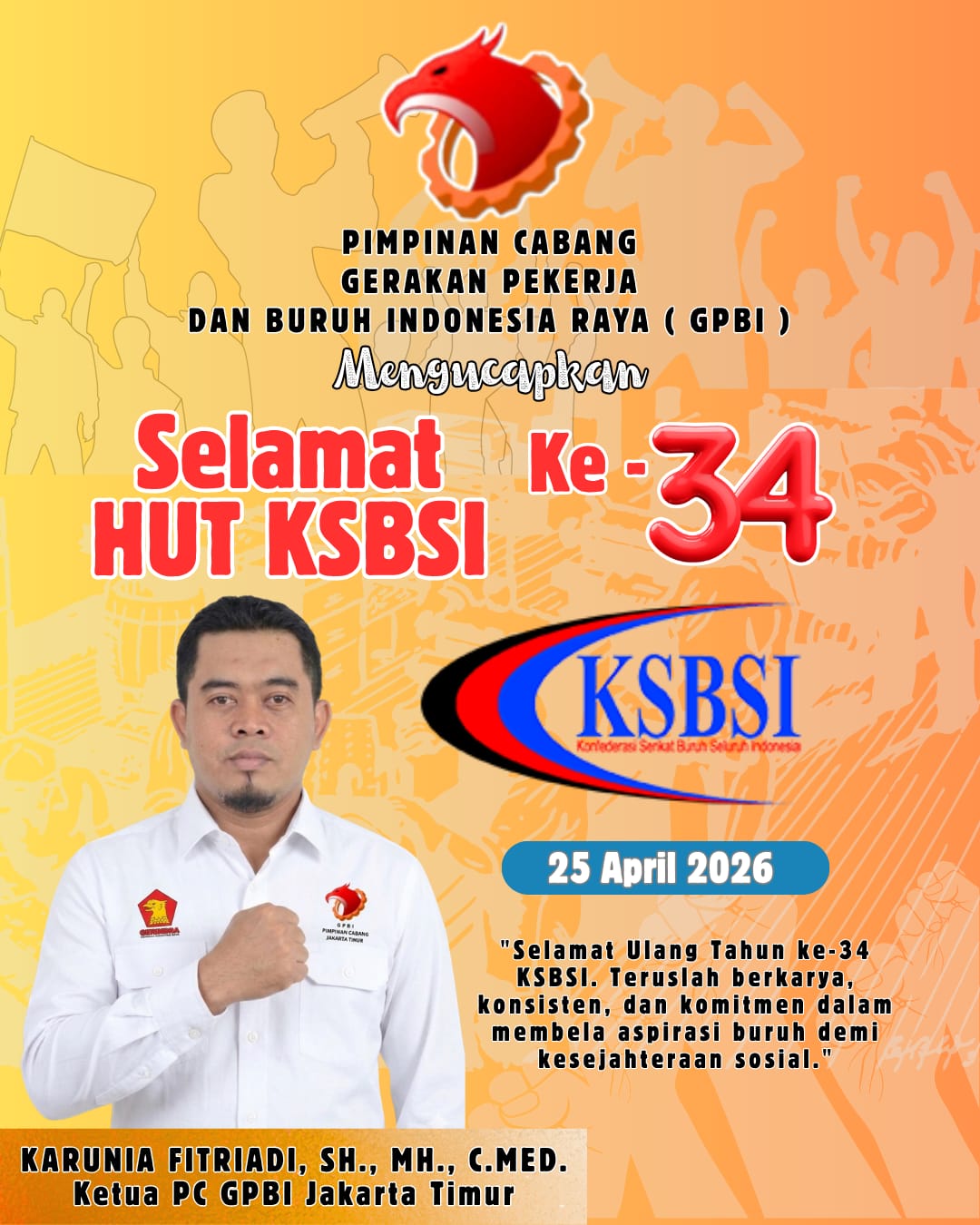 GPBI Jakarta Timur juga menyampaikan ucapan selamat ulang tahun ke-34 kepada KSBSI, disertai harapan agar organisasi tersebut terus menjadi kekuatan utama dalam memperjuangkan aspirasi pekerja.