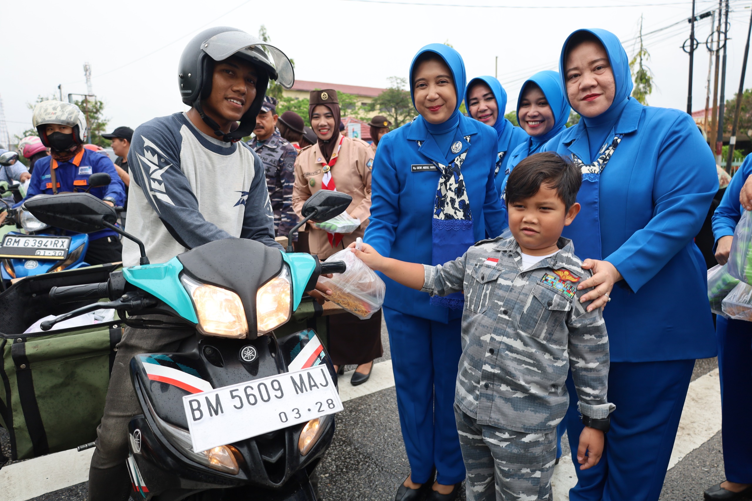 Bertempat di Monumen Meriam KRI Dumai, Komandan Pangkalan TNI AL Dumai Kolonel Laut (P) Abdul Haris, didampingi oleh Ketua Jalasenastri Cabang 4 Korcab I DJA I Ny. Dewi Abdul Haris, membagikan takjil gratis kepada para pengguna jalan yang sedang melintas.