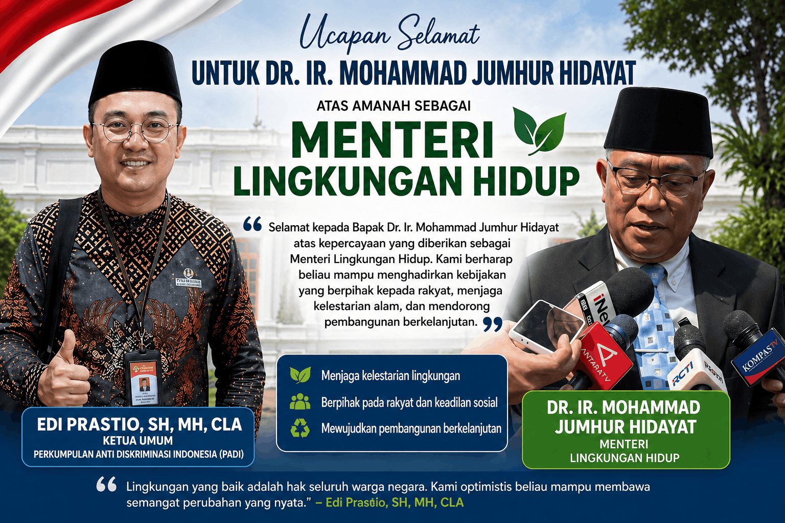Ketua Umum Perkumpulan Anti Diskriminasi Indonesia (PADI), Edi Prastio, SH, MH, CLA, menyampaikan ucapan selamat kepada Dr. Ir. Mohammad Jumhur Hidayat atas amanah baru sebagai Menteri Lingkungan Hidup.