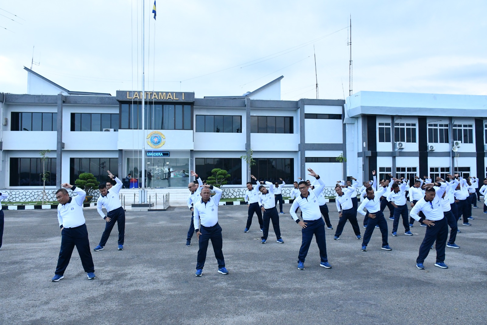 Indonesiakoma – TNI AL, Belawan,- Komandan Pangkalan Utama TNI Angkatan Laut I (Danlantamal I) Brigjen TNI (Mar) Jasiman Purba, S.E., CHRMP., melaksanakan olahraga bersama personel Lantamal I, bertempat di Lapangan Apel Mako Lantamal I, Jalan Serma Hanafiah No. 01 Belawan, Sumatera Utara, Selasa (13/8/2024).