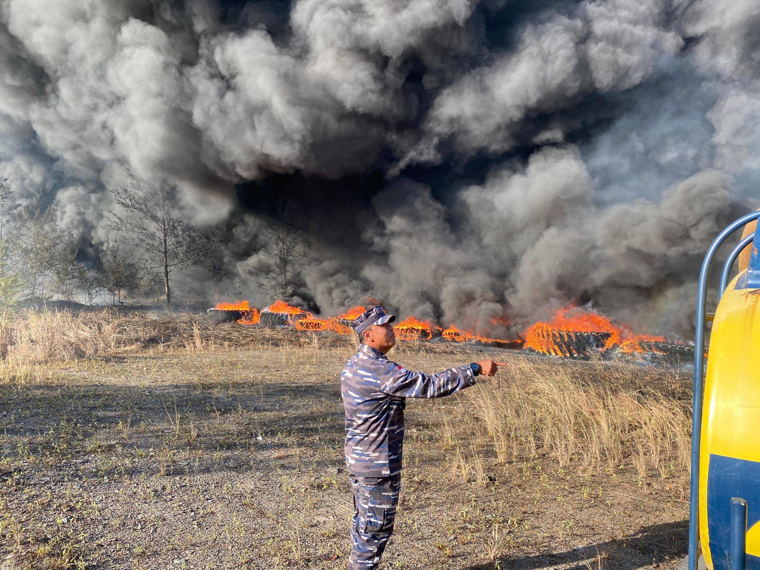 Indonesiakoma.com TNI AL, Bintan,- Pos TNI Angkatan Laut (Posal) Kijang bersama aparat setempat dan masyarakat bahu membahu menangani kebakaran yang menghanguskan ratusan ban kendaraan bekas di Lahan Eks Tambang Batu Granit PT. Panglong, Kijang Kota, Sabtu (03/08/2024).