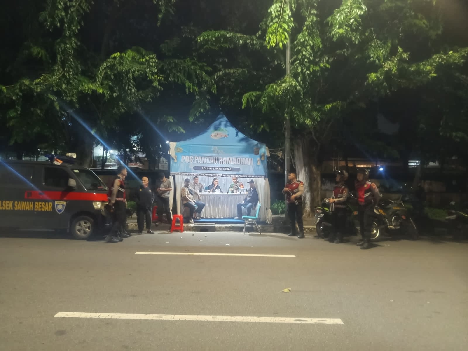 INDONESIAKOMA – Jakarta Pusat — Polsek Sawah Besar bersama Pokdar Kamtibmas melaksanakan penjagaan Pos Pantau Ramadan 1447 H di kawasan Dobrak Jl. Gunung Sahari Raya, Pasar Baru, Sawah Besar, Jakarta Pusat, Senin (23/2/2026) pukul 22.00 WIB. Kegiatan dipimpin Kanit Binmas AKP Dwi Budianto, SH dengan tujuan mengantisipasi tawuran, petasan, serta gangguan kamtibmas menjelang waktu sahur selama bulan Ramadhan.