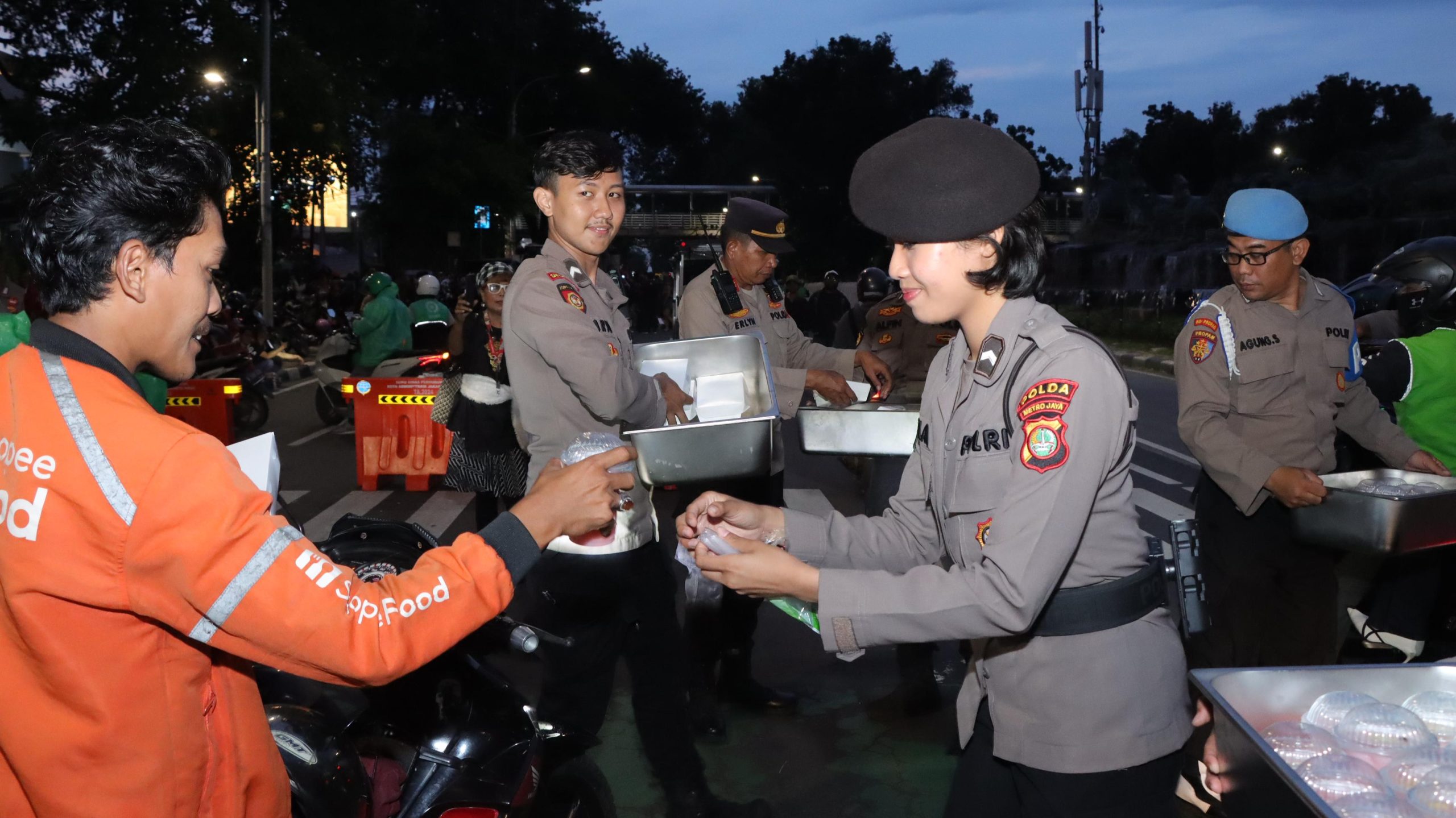 Dalam kegiatan ini, polisi menyiapkan dan membagikan 100 kotak nasi siap saji serta 200 es buah kepada masyarakat yang masih beraktivitas menjelang waktu berbuka puasa. Sasaran pembagian takjil meliputi pengunjuk rasa, sopir bajaj, kusir delman, pengemudi ojek online, pejalan kaki, pengemudi taksi, dan pedagang asongan.