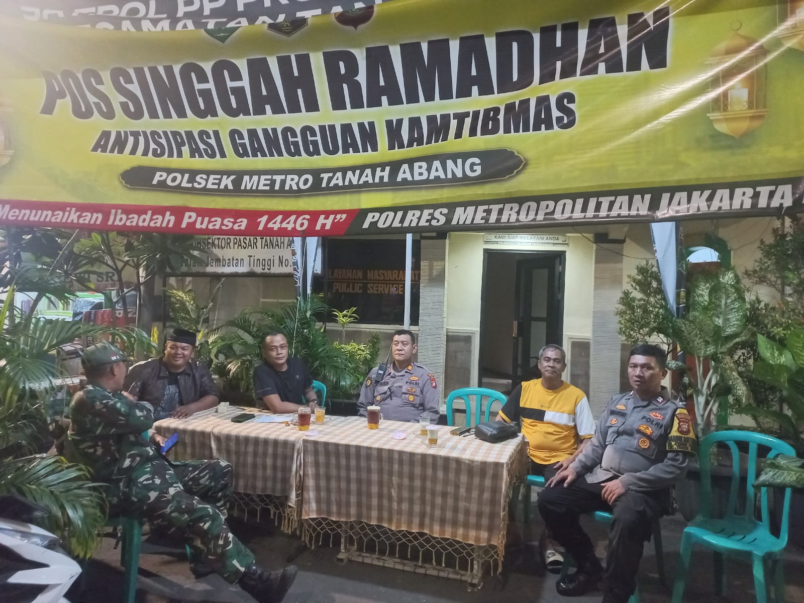 Indonesiakoma.com Jakarta Pusat – Polsek Metro Tanah Abang melakukan pengamanan dan monitoring selama bulan suci ramadhan 1446 H/2025 M di Pos singgah ramadhan RW 09 Kelurahan Kebon Kacang Kecamatan Tanah Abang Jakarta Pusat. Selasa (25/3/2025) dini hari.